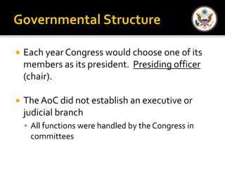 Describe the structure of government set up under the Articles of Confederation AoC Explain why the weaknesses of the Articles led to the Critical Period for the government in the 1780s Describe how a growing need for a stronger national. Describe the structure of the government set up by the Articles of. The Articles had a unicameral Congress one house.